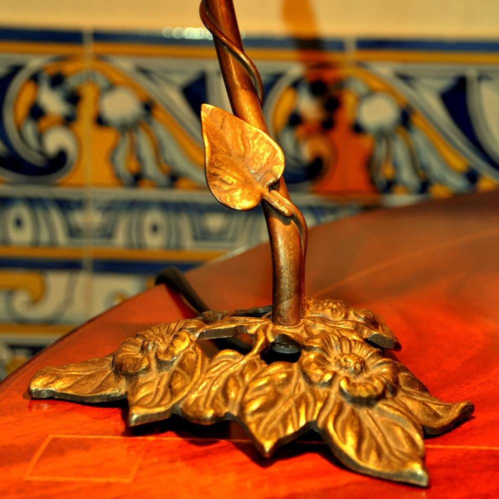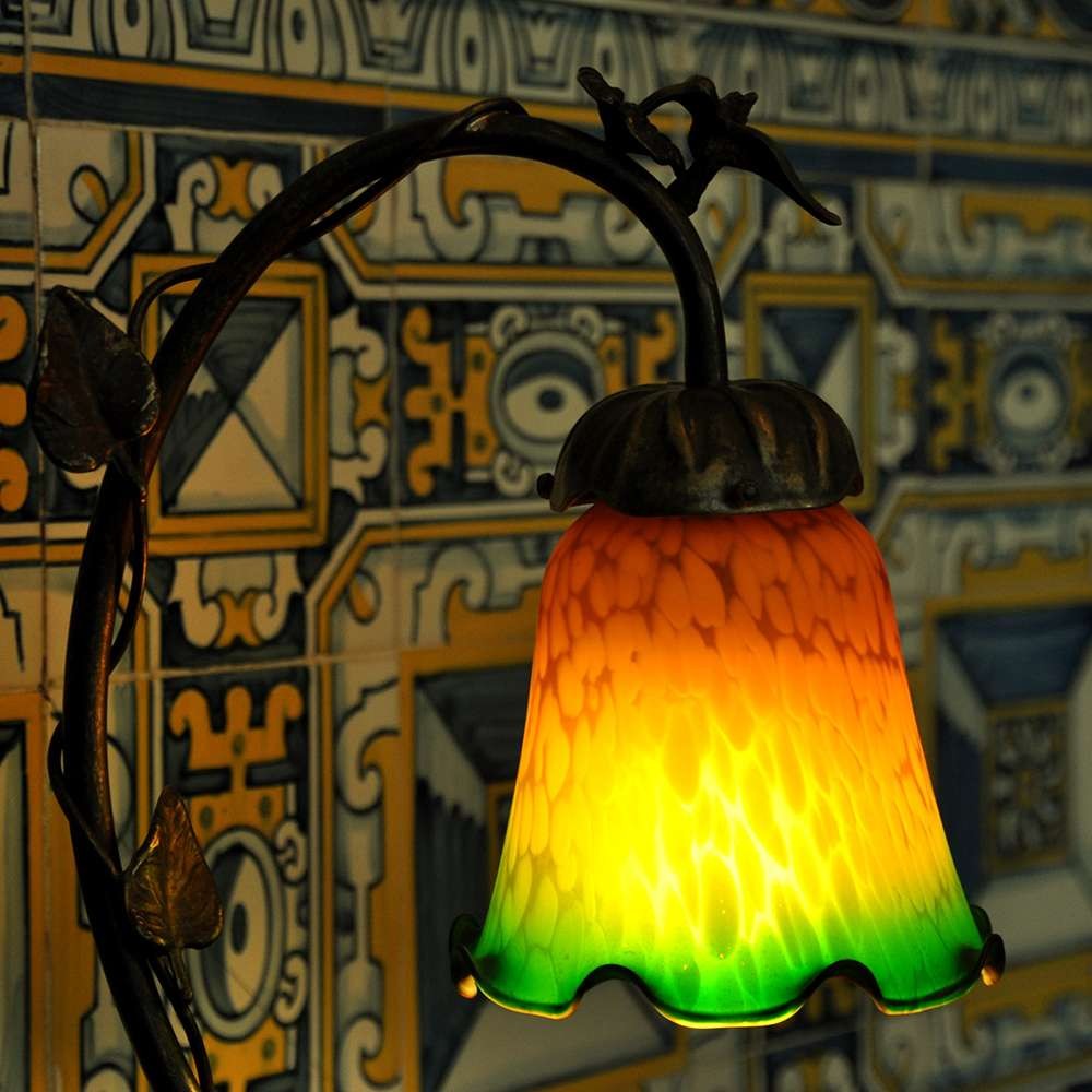 Candeeiros (par) Arte Nova, com motivos vegetalistas e tulipas em pasta de vidro em tons de amarelo e verde com motivos orgânicos, trabalhadas à mão.
