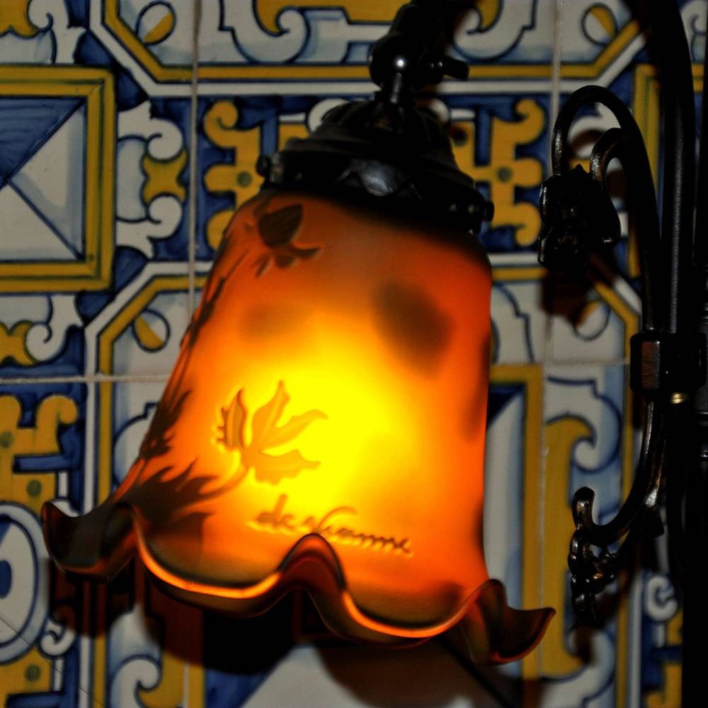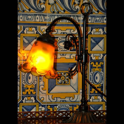 Candeeiro de mesa da Vianne, estilo Arte Nova, pé em antimónio, tulipa em pasta de vidro com motivos vegetalistas.